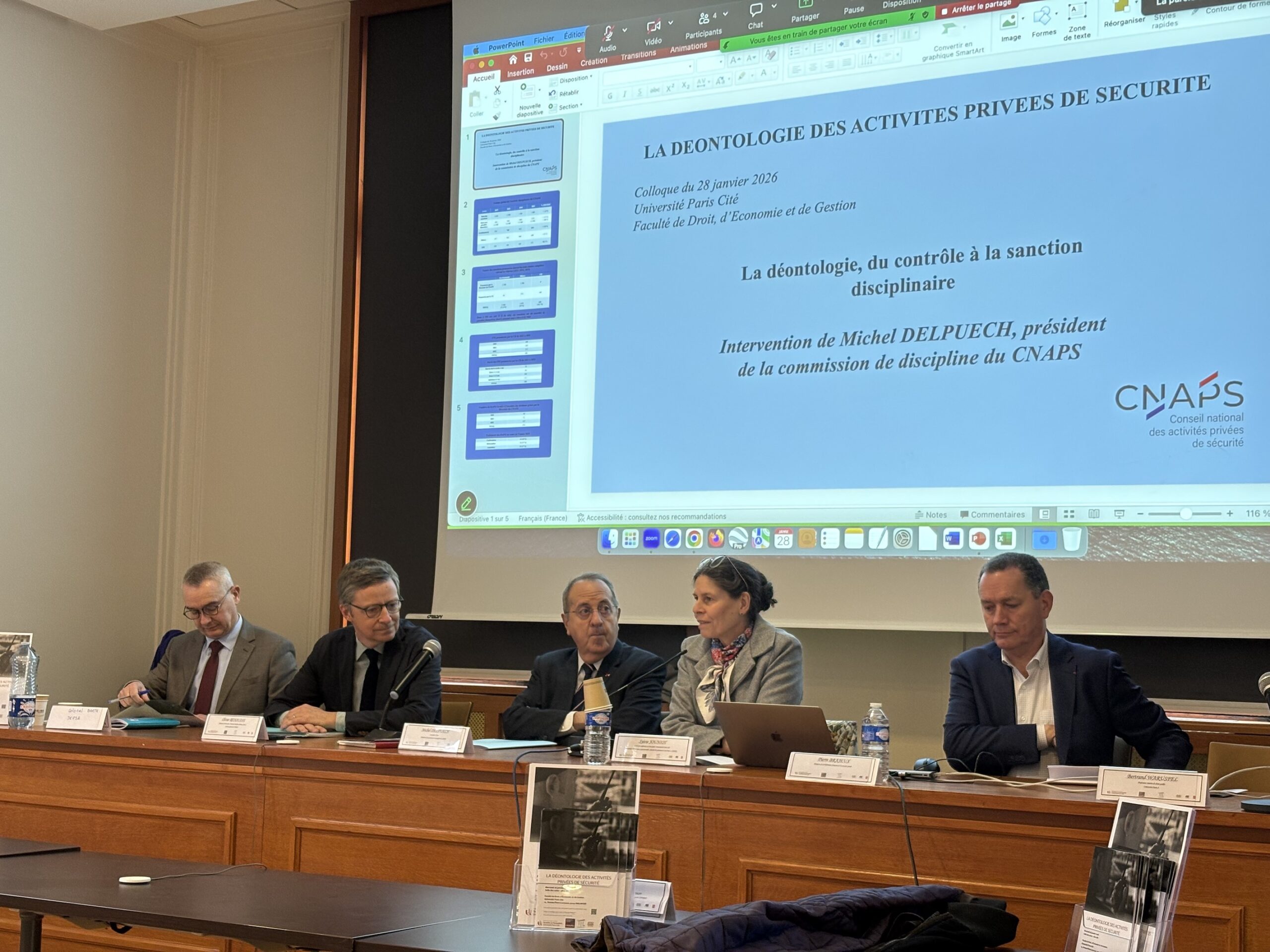 Le lundi 28 janvier 2026 s’est tenu le Colloque “La Déontologie des Activités privées de Sécurité” à la Faculté de Droit d’Économie et de Gestion, coorganisé par l’Université Paris Cité (Licence professionnelle « Sécurité des biens et des personnes »), l’Université Côte d’Azur (Centre de recherches en droit administratif, constitutionnel, financier et fiscal), l’Association française de droit de la sécurité et de la défense